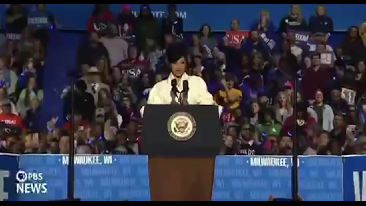 Hip-hop singer Cardi B's teleprompter broke while speaking in support of Kamala Harris, leaving her confused for over a minute until someone brought her a phone with the rest of the text.