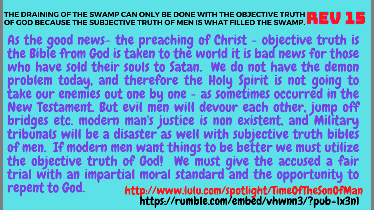 Rev. 15 THE ONLY WAY TO DRAIN THE SWAMP IS WITH GOD'S PERFECT MORAL STANDARD!