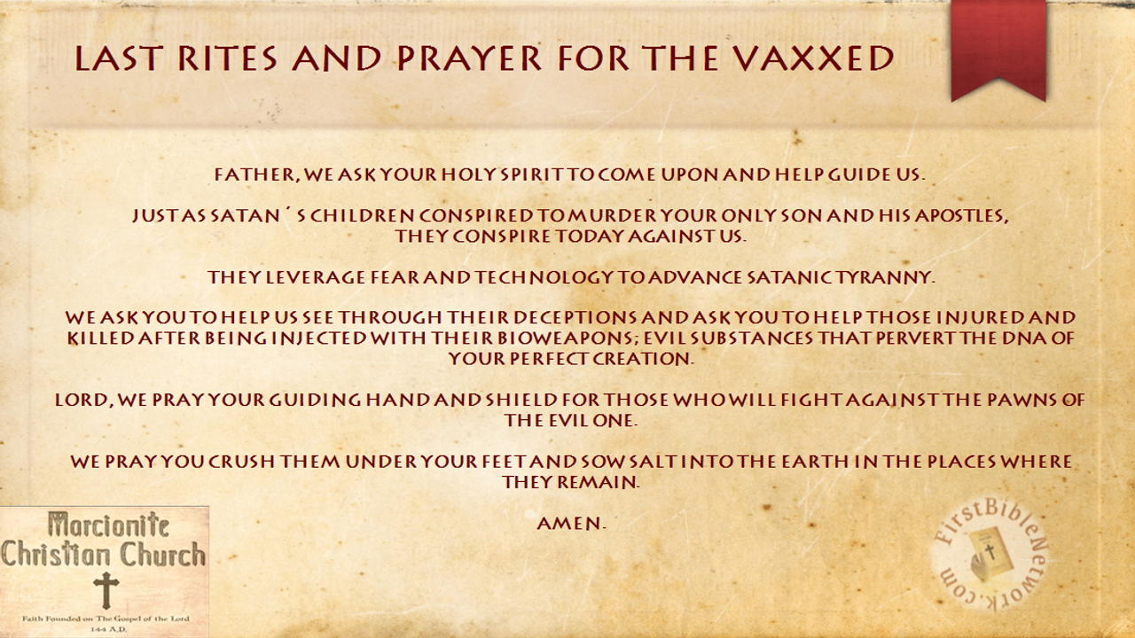This is the prayer authorized by the Marcionite Christian Church to be recited to those who have been injected with the Covid RNA gene-mutator.