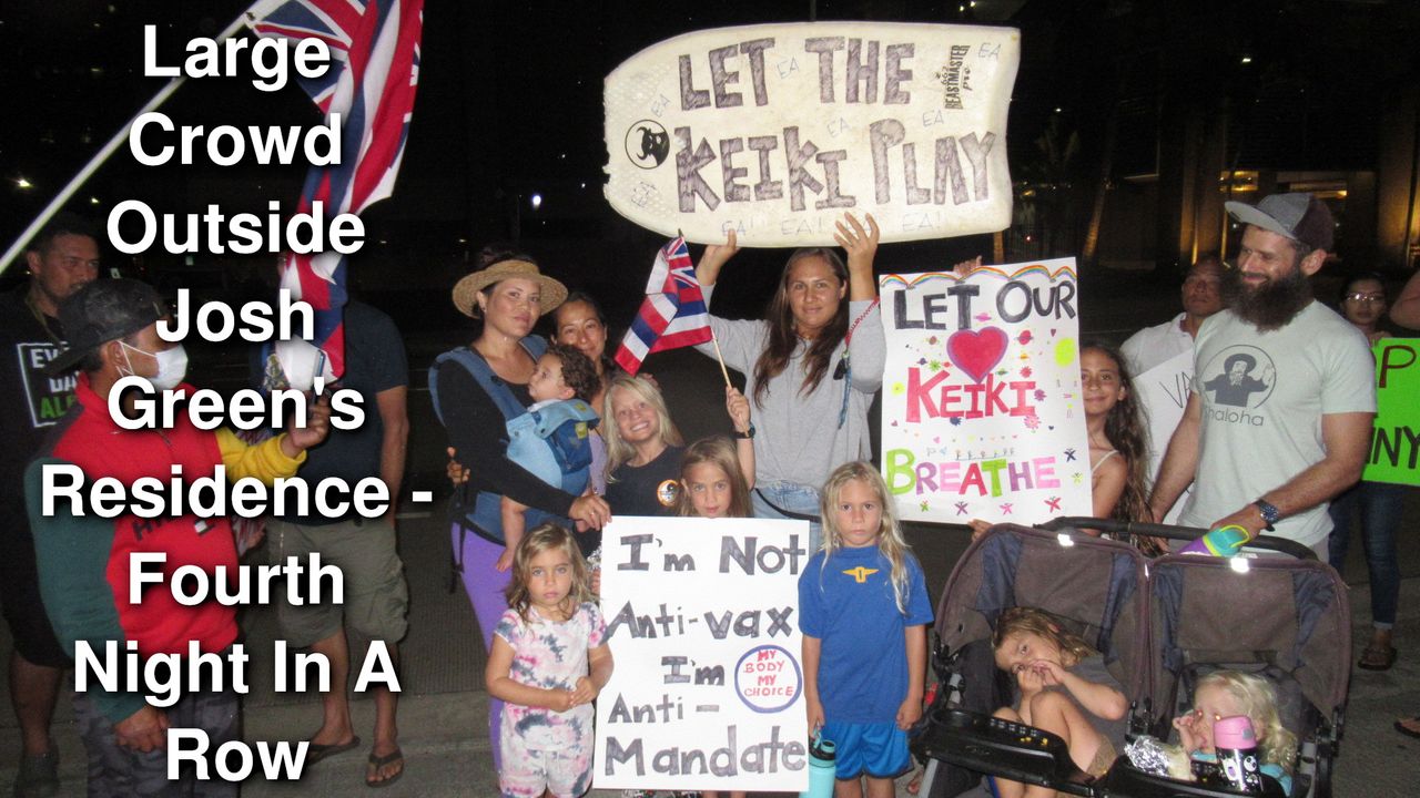 On August 14, 2021 at about 7:30pm, a crowd of protesters returned for the fourth night in a row demanding Josh Green bring an end to the vaccine and mask mandates. Eggs were thrown from balconies above and police issued some people tickets for honking. A KHON2 news camera man arrived late as people chanted “the media is the virus”.