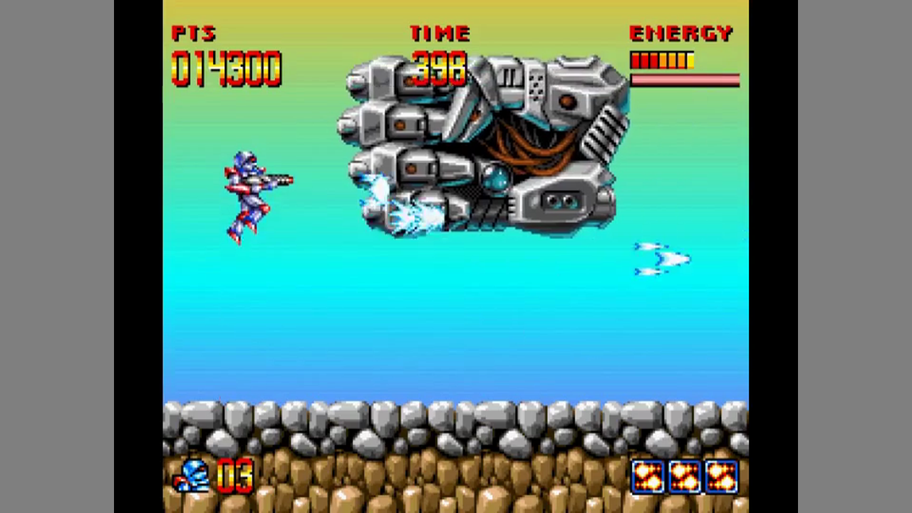 The game takes elements from Turrican and Turrican 2 and combines them with new levels. You have mostly the same weapons and moves as in Turrican, but the beam weapon now only stuns enemies instead of harming them. Also, your character is now invincible for a short time when hit and gets knocked back a little instead of constantly losing health while touching an enemy.