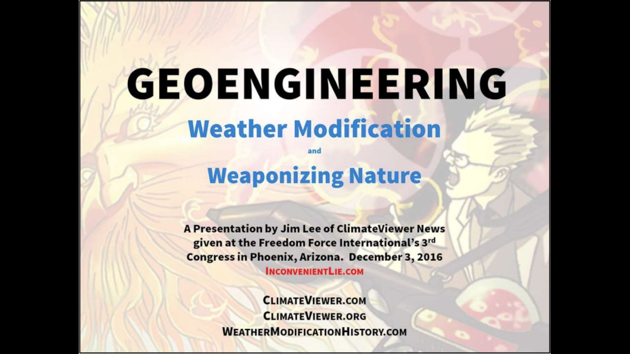 Slide Notes on Scribt: https://www.scribd.com/document/333694700/Geoengineering-Weather-Modification-and-Weaponizing-Nature-by-Jim-Lee-ClimateViewer-News-December-3-2016-SLIDE-NOTES