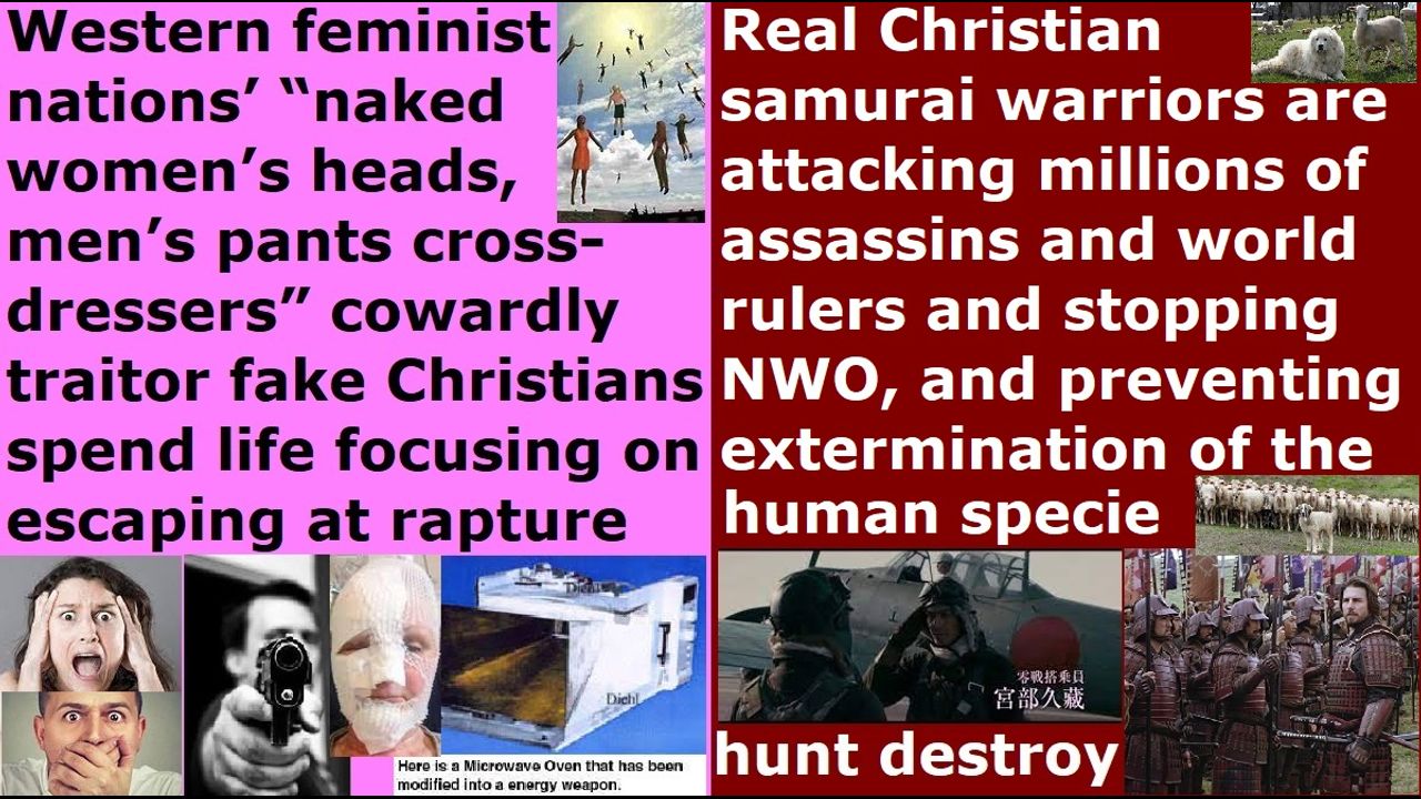 The real Christian samurai warriors of Christ are attacking the millions of CIA NSA MI6 FBI Freemason Jesuit Wicca Black Ops Satanist assassins and world rulers and their black nobility families nephilim & chimera fake alien incarnate avatar bosses and Draco empire space fleets and fallen angels and Satan Lucifer and the earth’s hidden matriarchal rulers pedophile cannibal Satanist reptilian hybrid witch feminists, who are torturing & lesbian raping (pegging) & satanic sacrificing & eating 12 million children and throwing their human meat & bone ashes into the supermarket groceries & church food & fast food, by exposing all their names & identities & organizations & secrets & crimes & methods & plans & activities, so that everyone will come to try to assassinate them every day and cook them alive with CIA microwave oven weapons from next door homes & rooms and all the church donators will ridicule them as lunatic heretic idiotic narcotic maniacs, in order to restrain the spirit of the AntiChrist and protect the human specie populace from extermination. They will sometimes receive a dozen assassination attempts a day by FBI pinpoint heart attack EMF weapons, and US military spec ops Satanist black magician “heart exploding” psychic assassin psionic warfare department soldiers, and demon spirit SIDS suffocation attacks, and flesh-eating bacteria HIV biochemical weapon attacks, and income cut off imminent starvation attacks, and family’s brains controlled to try to kill them, and witchcraft & psychic attacks, and CIA NSA MI6 FBI Freemason Jesuit Wicca Black Ops Satanist assassins trying to shoot them in the head in their apartment lobbies, and so on and so forth. They uphold God’s honor & duty & name & righteousness & faith & holiness & self-sacrificial love of Jesus. After we real Christian samurai are raptured into heaven, there will be no more protection for these fake Christians, who no one is trying to kill frantically right now.