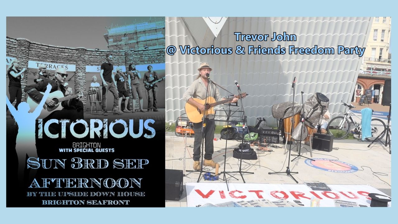 Trevor John performing his songs 'Clown World' and 'Not My King' at Victorious & Friends Freedom Party by the Upside Down House on Brighton Beach, Sunday 3rd September 2023.