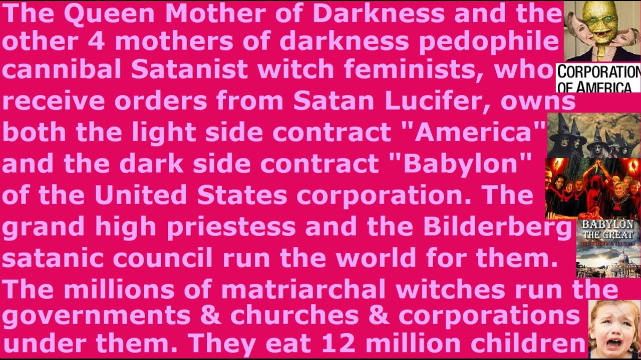 *** Intelligence news update from the Human Homo-Sapiens Race Survival Resistance (HRSR) headquarters and Republic Rebel Alliance battlefront (January 2025). The Draco reptilian chimera fake alien incarnate avatar pedophile cannibal Satanist witch feminist “Queen Mother of Darkness” owns the United States contract with the 4 other “mothers of darkness.” There are two sides to the contract which are the dark and light side. The dark side is called “Babylon” and the light side contract is called “America.” The matriarchal rulers, who receive orders from Satan Lucifer directly, and who own the world and run the world, have two different titles for ruling the United States, such as death & destruction & chaos & terror for the dark side Babylon and wisdom & justice & liberty & freedom for the light side America. There is a spiritual contract and a physical contract, and under the physical contract the United States is a privately owned corporation of the earth’s hidden matriarchal rulers and not a Constitutional republic. Under the mothers of darkness are the sisters of light and the grand high priestesses and the high priestesses. Under them are the Bilderberg satanic druid council who manage the world. The “sisters of light” are the witchcraft assassins, so that is why the millions of cowardly traitor scumbag devil-loyalist fake Christians hide in fear and do not expose their existence & their 5,000 year Noah’s days nephilim Atlantis matriarchal rulers of earth, and they cover-up for them their tens of thousands of crimes that we real Christians shared to them in our daily sermons for decades and their eating of 12 million children every year, and give their fake Christians’ human authority permission for all their evils by their silence, and therefore have the blood of 6 billion people on their hands, because of fear of assassinations and ridicule from church donators. The millions of matriarchal witches run the governments & corporations & churches & militaries & media & schools & courts & police through the 5 Satanist departments called the Catholics & Mormons & Freemasons & Cabals & Satanists. They torture & lesbian rape (peg) & eat & satanically sacrifice 12 million children to Satan Lucifer and his fallen angels to feed on their human soul energy to parasite survive because they are cut off from God’s life source energy, and in exchange, they receive high positions in society & power & wealth & fame & popularity & occult knowledge & witchcraft abilities. The whole system is a parasite system. They cook alive with CIA microwave oven weapons from next door homes & every hotel room the real Christian samurai warriors of Christ, in order to try to kill them and silence them, because we real Christians prevent their nuclear wars & biochemical weapon pandemics & manufactured famines & Godzilla titan demon armies out of the abyss by speaking out the tens of thousands of truths by denying permission, while the millions of Western feminist nations’ “Bible verses redefining, uncovered women's heads rebels, fallen angel head controlled, men’s pants cross-dressers androgynous transgender” fake Christians and millions of Nicolaitan clergy class laity class Satanist pagan religious system's "ordained & allowed & trained & non-assassination-attempts-receiving" fake unbiblical job position pastors give human authority permission to Satan Lucifer & the fallen angels to do all those things and replace 33% of the Western feminist nations’ populations with non-human nephilim & chimera fake alien incarnate avatars. Even worse, they even have the audacity to bring greater judgment upon themselves by insulting God by trying to appease both Satan Lucifer & God by modifying & diluting & sterilizing & picking & choosing & editing the tens of thousands of truths we real Christians shared to them in our daily sermons for decades, in order to make it safe for themselves from assassination attempts and ridicule from church donators.