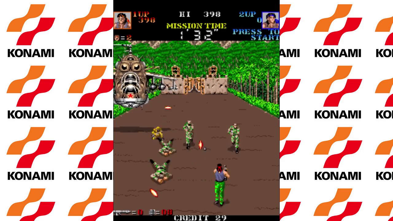 The game is played from a third-person perspective. You move your character towards the screen, while enemies will come "from" the screen. If you a get hit, you loose life, and there is a strict time limit for each level. You can move left and right, and forwards, but not backwards. Your main weapon is a gun with unlimited ammo. Your shots have limited range, however. There are two additional weapons, rockets and grenades. Both are limited, but shot down enemies sometimes leave behind rockets or grenades. Grenades are thrown with the second button. Rockets can only be used with large targets like guard towers, helicopters or jeeps. If you can shoot a large target, a crosshair will appear over it. If you then throw a grenade, your character will fire a rocket at the marked target.