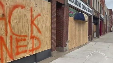 Businesses, apartments and other buildings boarded up in downtown Akron, where several days of protests have taken place over the Akron PD shooting death of Jayland Walker.