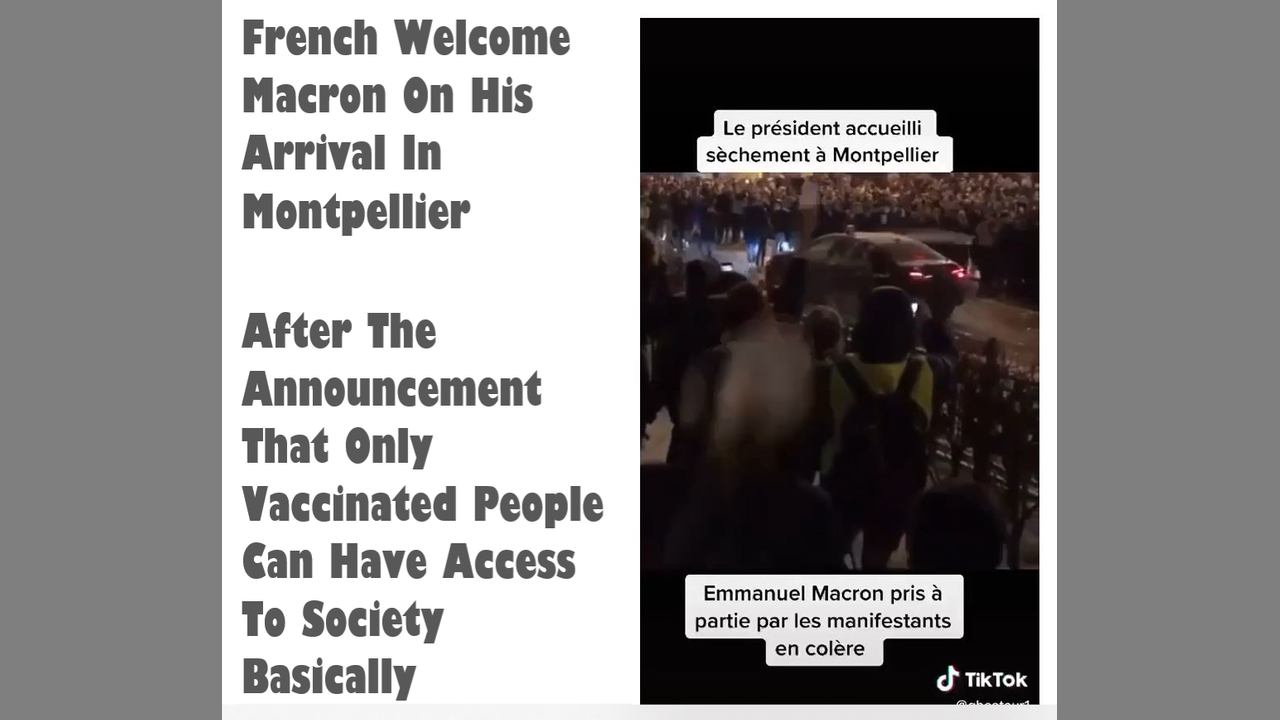 Thus, the BRAVEN French welcome Macron on his arrival in Montpellier, after the announcement that only vaccinated people can go shopping, can go to the cinema and other illegal measures that he cannot implement in his country, but which they use as here in their propaganda campaign of the "vaccine" and the spread of fear to drive more people to the slaughterhouse. The mass demonstrations of French citizens against this genocidal health dictatorship continue and are made up of both vaccinated and unvaccinated people. France knows that this is not a health issue, but a FIGHT FOR ITS RIGHTS AND FREEDOMS. BRAVO, VIVA LA FRANCE!
