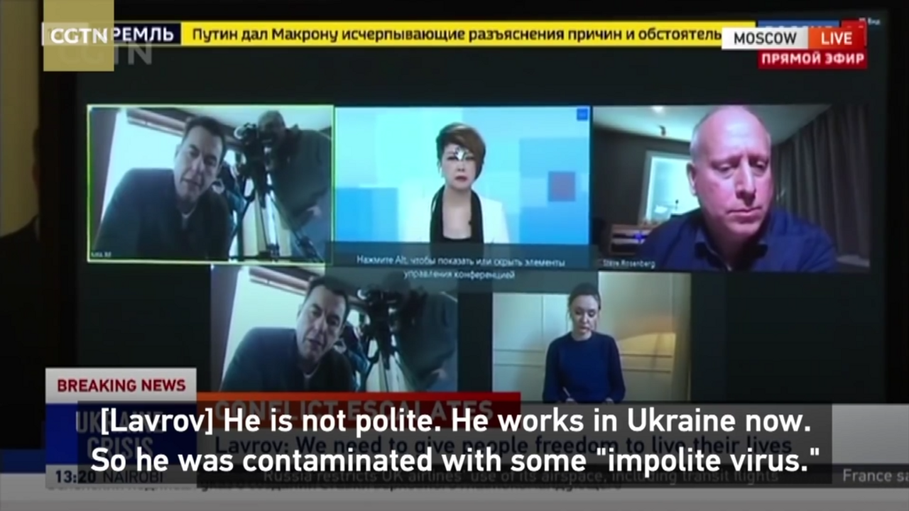 "Russian Foreign Minister Sergey Lavrov criticizes CNN journalist contaminated with "impolite virus" for refusing to let Chinese media speak in a live press conference on Russia-Ukraine tensions on Friday. Lavrov said, "If you are in Ukraine and they somehow ruined your good manners, we have nothing to do with that." - CGTN
