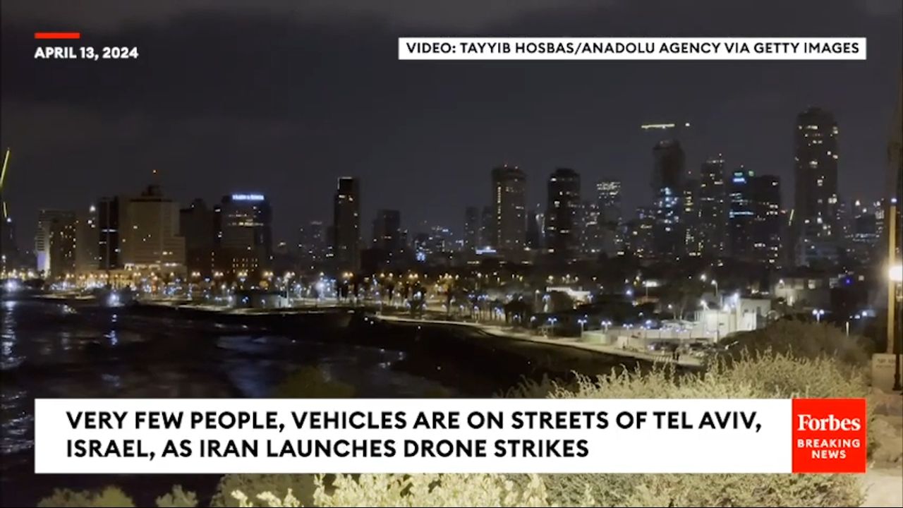 Very Few People, Vehicles Are On Streets Of Tel Aviv, Israel, As Iran Launches Drone Strikes. The streets of Tel Aviv, Israel, are almost empty as Iran launches drone strikes.