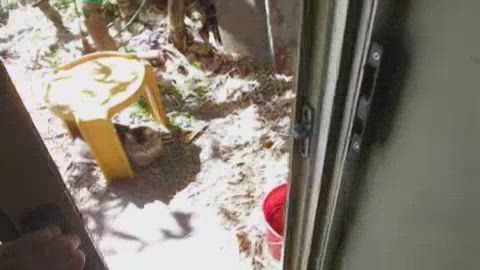 Cadbury is waiting for food outside under the little yellow table Where s Cadbury Now MVI_7632