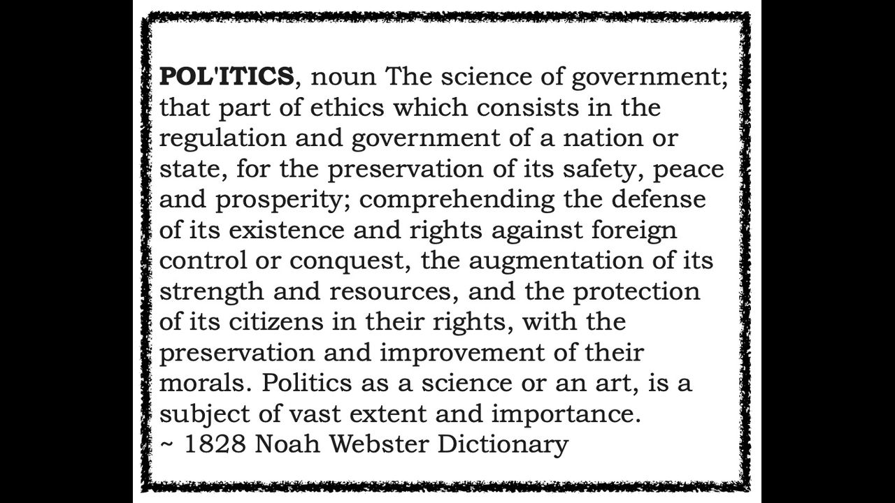 POL'ITICS, noun The science of government; that part of ethics which consists in the regulation and government of a nation or state, for the preservation of its safety, peace and prosperity; comprehending the defense of its existence and rights against foreign control or conquest, the augmentation of its strength and resources, and the protection of its citizens in their rights, with the preservation and improvement of their morals. Politics as a science or an art, is a subject of vast extent and importance. ~ 1828 Noah Webster Dictionary