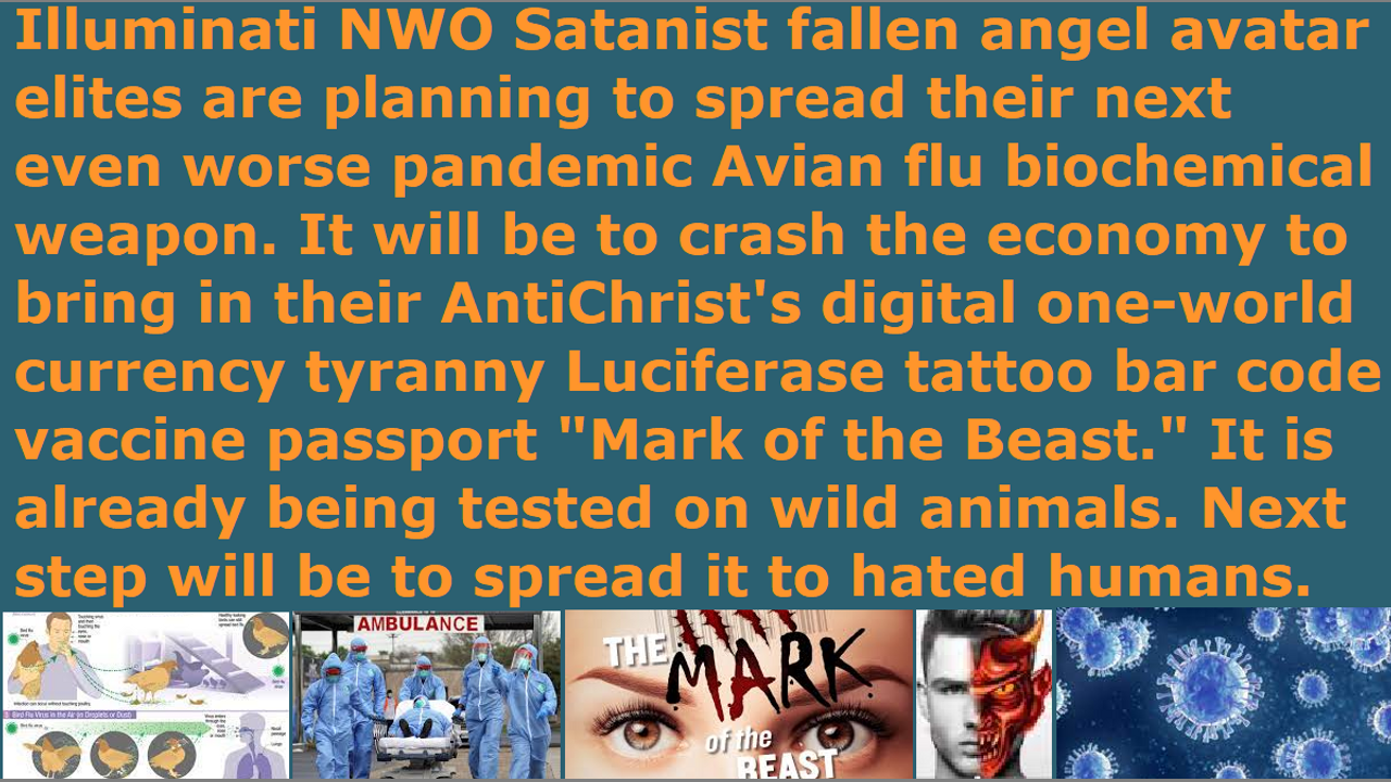 *** Intelligence news update from the Human Homo-Sapiens Race Survival Resistance (HRSR) headquarters and Republic Rebel Alliance battlefront (April 2023). Satan Lucifer’s Illuminati NWO fallen angel incarnate avatars are planning to spread an even worse new Avian flu biochemical weapon. It is being tested already on wild animals. The next step is to spread it to the hated humans. This one is expected to be worse than the COVID biochemical weapon that the real Christian spiritual army and God stopped. These biochemical weapons are reported to be produced in Ukraine’s bio labs. They plan to use it to crash the economy and to introduce the vaccine passport digital currency NWO one-world economy tyranny Luciferase tattoo “Mark of the Beast” by the AntiChrist. The person in the video is making people focus on their own power to stop it, but it is a warning from God of judgment against the Western feminist nations for redefining hundreds of Bible verses to replace Jesus with hundreds of fake foreign gods. They should be repenting instead, and praying to stop it. The only power that can stop it is God and his real Christian warriors, as in all nuclear wars and pandemics and economic crashes and demon armies and asteroids in the past. The ones who are allowing all of this are the Western feminist nations’ “Bible verses redefining, women’s head coverings rebelling, fallen angel head controlled rebels” “Satan Lucifer’s post-1960s cross-dress-project men’s pants wearing God’s Word mockers” “unbiblical post-1873 10% salary illegal tithe income tax thieves extortionists” religious Christian hordes and Satan Lucifer’s “ordained & allowed & trained & non-assassination-attempt-receiving” fake unbiblical job position pastors, who redefined hundreds of Bible verses, and replaced Jesus with hundreds of fake foreign gods, and removed God’s spiritual protection to allow the release of millions of these fallen angels to exterminate them with sword & famine & plague & demon armies, who are condoning all of this evil by their silence because of their fear of assassinations and ridicule from church donators. They come to our real Christians’ websites whenever there is a 9.11 false flag terrorist attack or a COVID false flag pandemic or a 2007 false flag stock market crash or a false flag Ukraine war or a false flag hurricane Katrina, because their pastors do not teach them the truth, and although they hate what we teach and the original Bible verses, they stay around reading only things that they are concerned or afraid of for a year or so, then when everything seems to be alright, they drift away back to their religious lives. They neither repent of the things we told them, nor do they restore the hundreds of original Bible verses that they redefined and stop worshipping those hundreds of fake foreign gods, nor do they speak the truth that they found out because of fear of assassinations and ridicule from their church donators as lunatic heretic idiotic narcotic maniacs. They read our real Christians’ sermons or watch our videos that may indicate imminent rapture very fervently, but they ignore and hate our sermons that have anything to do with repenting of their redefining of Bible verses, and they do not share the truths they find out because they do not want to get cooked alive by CIA microwave oven weapons from next door homes & rooms for Christ and other people or get ridiculed by church donators, and they do not restore the original Bible verses because they will be hated by their church donators. The rapture may be another twelve years in the future, but they are only looking to escape their current condition with the rapture, instead of looking to endure any assassination attempts for their brethren and for their God and for the 6 billion genetically-unrelated total strangers who they care nothing for.