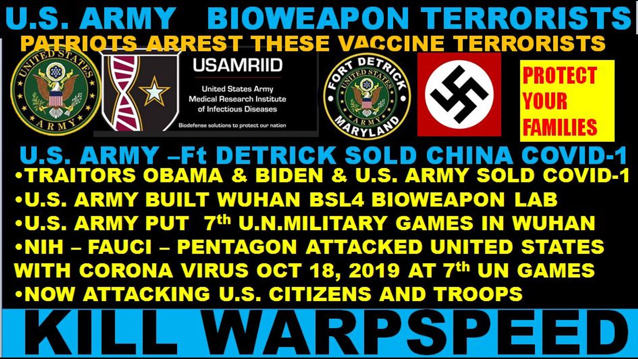 U.S. ARMY Ft DETRICK (NWO) IS BIOLOGICAL BIOWEAPON SITE THAT SOLD COVID-1 TO CHINA; COLLABORATED WITH CHINA (NWO & PATSY) TO ATTACK U.S. - SAME TERRORISTS WANT TO DELIVER WARPSPEED VACCINE
