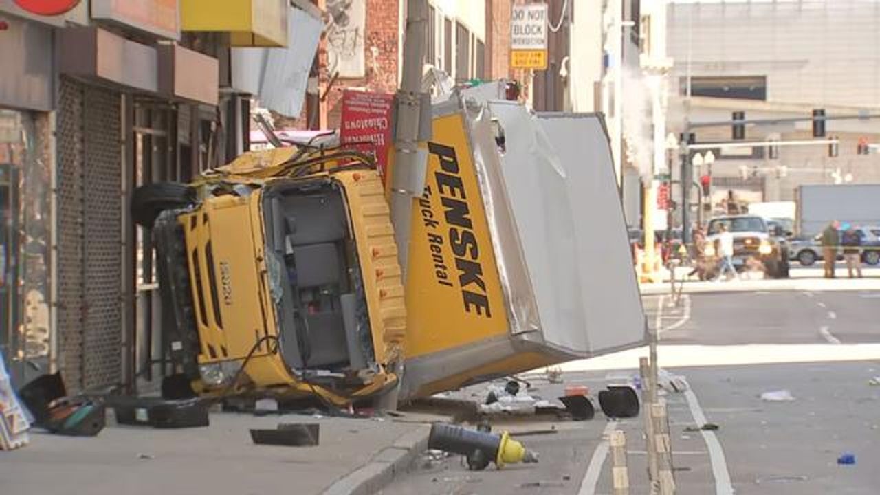 Surveillance video provided to Boston 25 News shows the Penske truck racing down Kneeland Street at a high rate of speed before it jumps the curb and hits a pole. The video shows onlookers racing to the crashed truck.