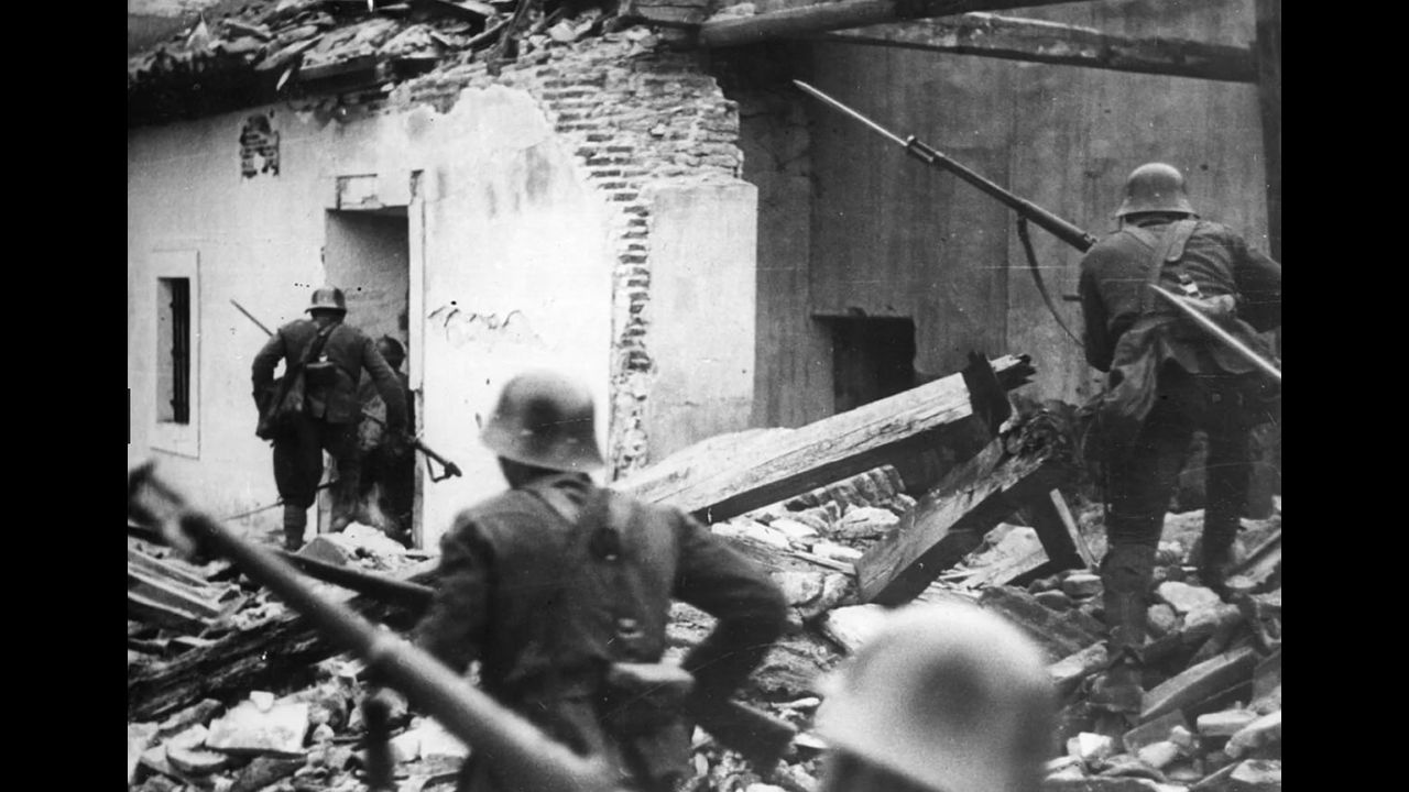 April 1937: Nationalist troops loyal to General Franco go bayonets fixed, through the ruins of houses at Madrid wrecked in air raids