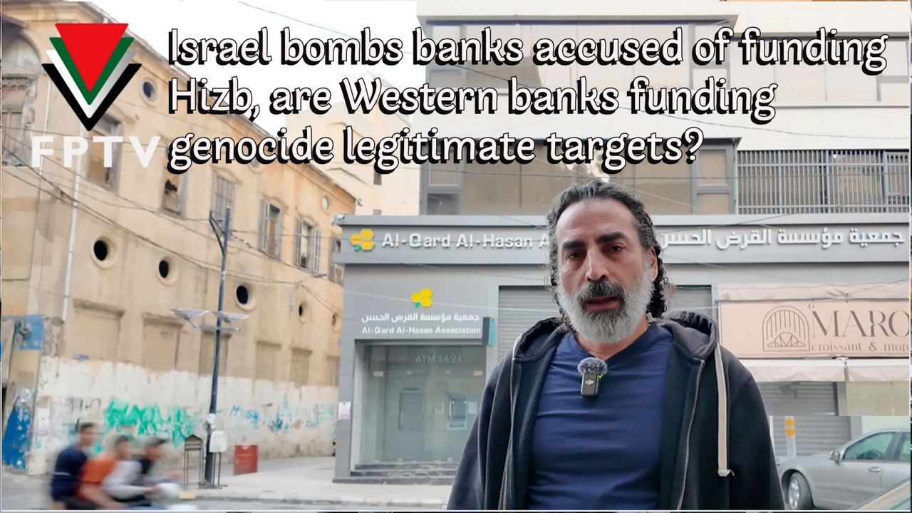 Laith Marouf visits a branch of the “Good Loan Coop Bank” in Beirut, after the Zionists attacked 10 branches across Lebanon; and asked the question: “If it is acceptable for Western leaders to bomb a bank accused of funding Hizb, is it acceptable to bomb Barclays, Citi Bank and RBC because they openly fund the Zionist regime? Would the attacks on the Twin Towers then be legitimate in targeting financial institutions funding USA wars?” This is the “civilised” logic of Western oligarchy and propaganda outlets.