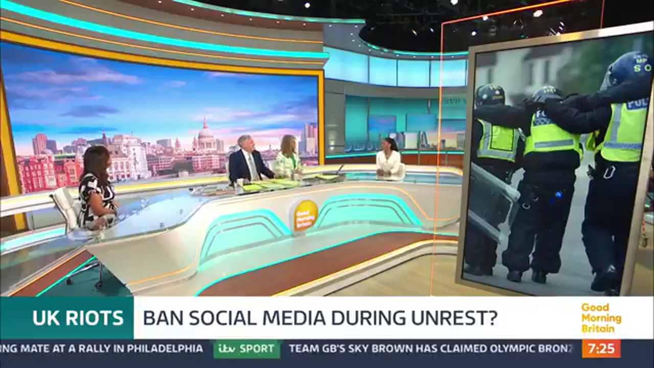 On Good Morning Britain they are debating the idea of shutting down 𝕏 (social media) temporarily to “stop misinformation for public safety”.rmaneen