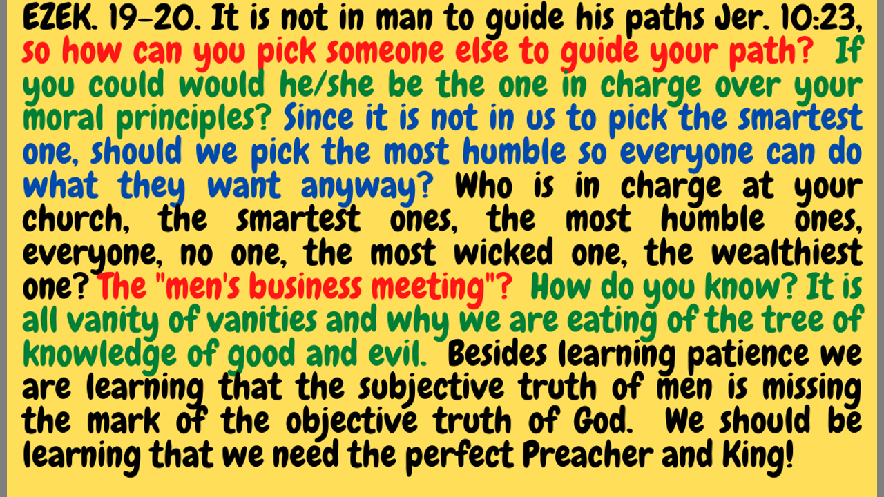 Ezek. 19-20. DENOMINATIONAL APOSTASY ENDS WITH THE REALIZATION THAT PREACHERS OF MEN CAN ONLY PREACH THE RELIGIONS AND PHILOSOPHIES OF MEN!