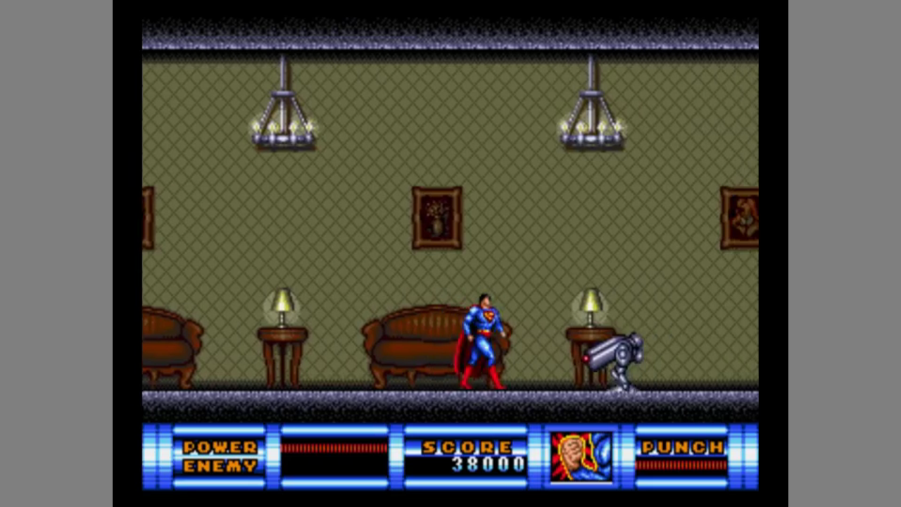 In most levels, Superman is out on foot. He can punch, jump, and use a superpower. In some stages, Superman is flying. Here, the screen scrolls automatically and he can shoot lasers from his eyes. In the platform stages, Superman can use different powers, but he can only one available at a time. To change powers, you need to collect a red S symbol. At certain points, use specific power is required to progress: some door can only be broken with the super punch, while at some points, you need the super spin to drill through the ground, for example. The powers in the platformer stages can only be used when the power gauge is full. It will empty after use and then refill over time. Collecting a silver S symbol will refill the power gauge at once. Finally, yellow-and-red S symbols refill your health.