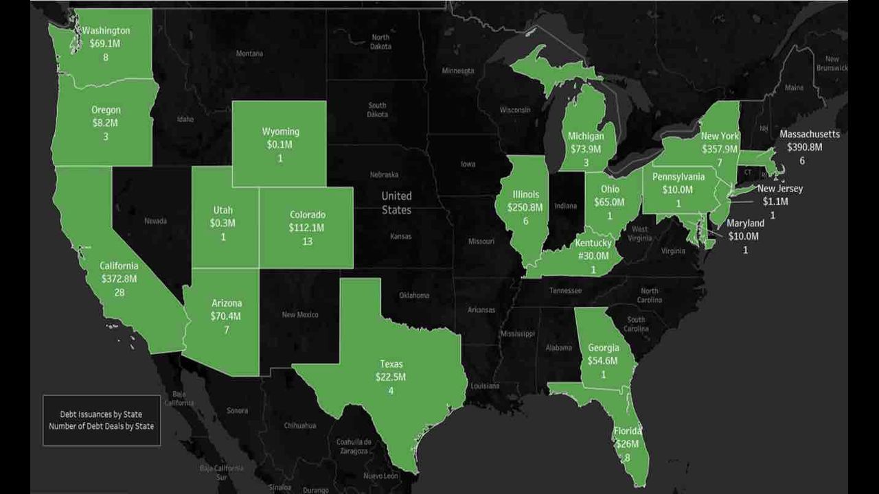 Like M&A, debt has moved eastward. California, Colorado, Oregon, and Washington jointly made up 34.5% of 2018 debt but only 5.4% of 2020’s debt. Illinois, Massachusetts and New York accounted for 93.0% of 2020 debt issuance.