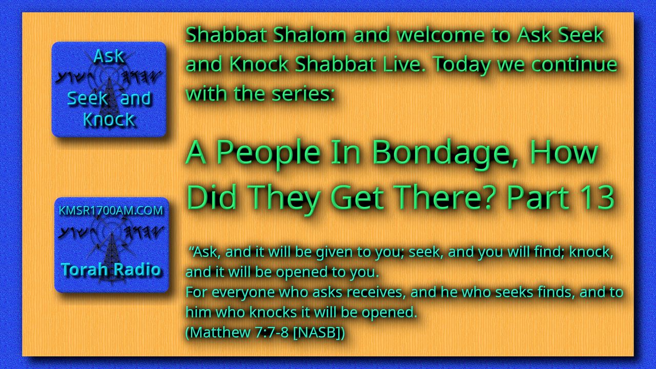 Shabbat Shalom and Thank you for Joining us with kmsr1700am.com for another addition of Ask Seek and Knock Shabbat Live Study. Today we will continue with the topic: “A People In Bondage, How Did They Get There – Part 13”. Today you will need the Scriptures, the book of Jasher, and you may want a notebook and a highlighter. If you have not seen the previous studies in this series, you may want to view them after you go through this study with us.