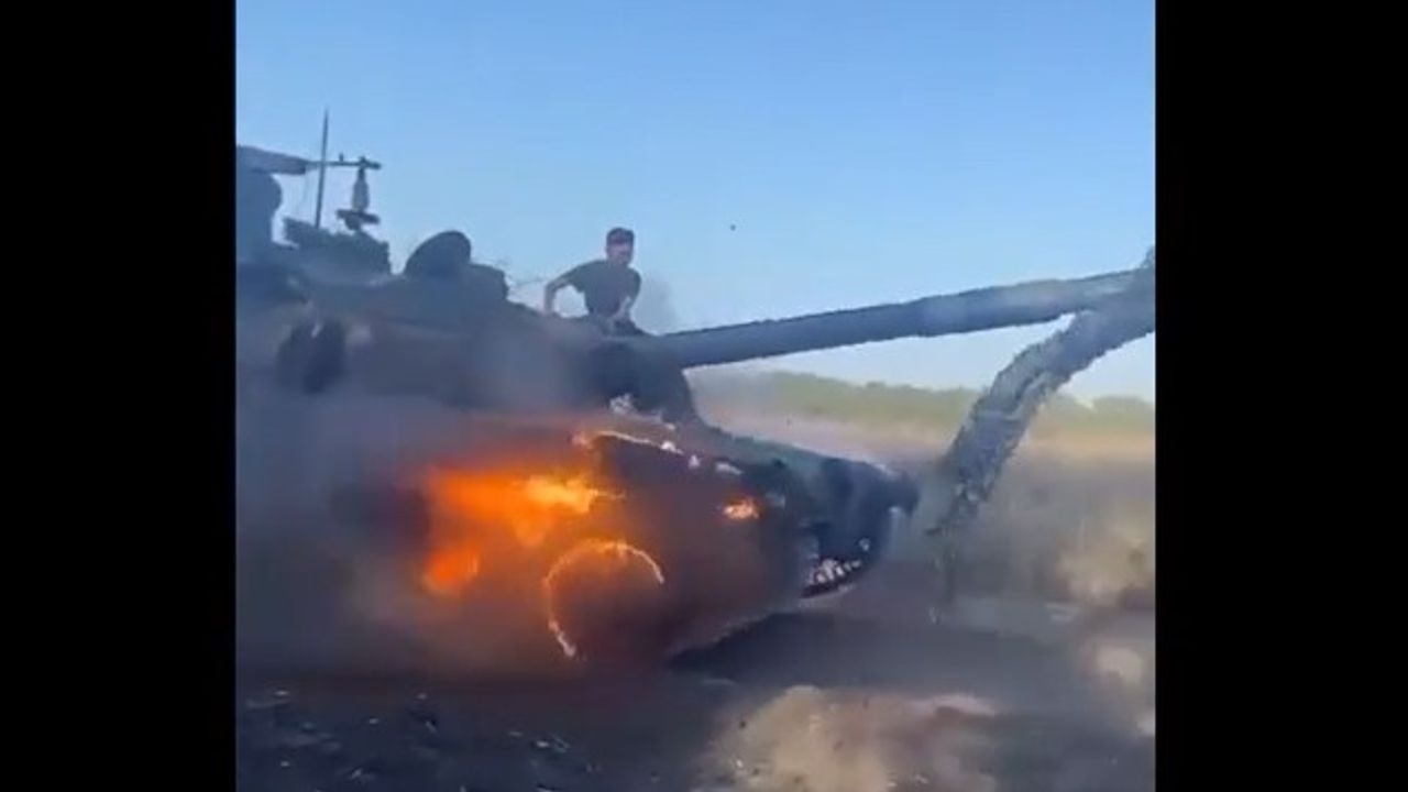 A slightly burnt ghost rider in the form of the T-90M returns to the rear after being hit by a Ukrainian FPV drone.