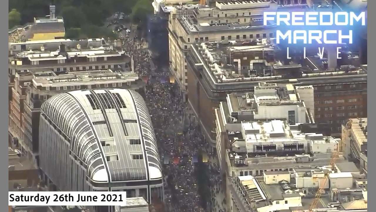 Raw helicopter footage from Freedom March Live, broadcast on 26th June 2021. Presented by Dr David Bull and Richard Tice. The live feed of the 90 minute flight over Central London showing crowds of hundreds of thousands of people marching from Hyde Park to Parliament Square.