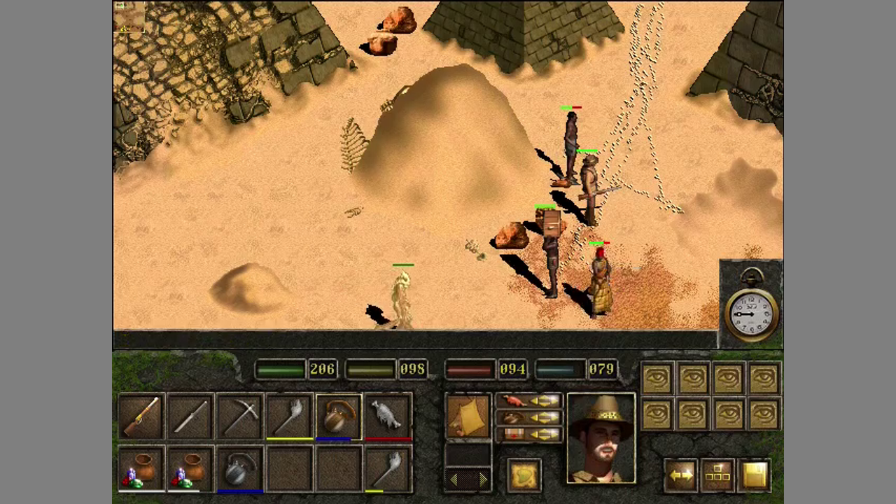 The game is played from an isometric view, similar to Diablo's. The game is divided into several missions, each takes place in an own environment. Each has an outdoor environment and a dungeon. The entrance to the latter must first be found. For the outdoor environment, you can hire up to six Africans as a party. They are either carriers (carry tents and items), warriors (suited for battle) or workers (remove boulders and other obstacles). Enemies are fought by simply clicking on them with a weapon equipped. Later in the game, you can also use magic. Each person in your party has a hunger and a thirst meter, and thus needs to eat and drink regularly. The game has a day and night cycle and changing weather. In dungeons, torches can be used to have more light, but they also exhaust over time.