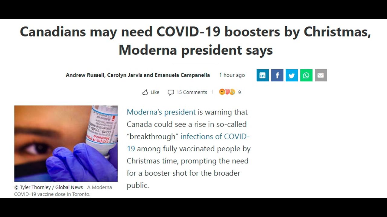 Canadians may need COVID-19 boosters by Christmas, Moderna president says