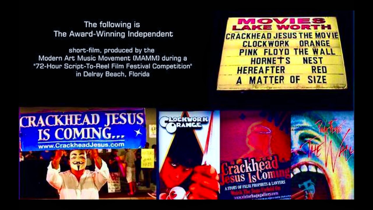 Crackhead Jesus The Movie: This controversial story of false prophets and lawyers, directed by Victor-Hugo Vaca Jr., was inspired by Florida Case # 50-2006-CC-016-579-XXXX-SB. The award-winning independent short-film, produced by the Modern Art Music Movement (MAMM) during a “72-Hour Script-To-Reel Film Festival Competition” in Delray Beach, Florida, was created by Team Beautiful Chaos, to introduce audiences to characters in a planned seven movie series based on the popular modern-art-graphic iNovel, “Redemption: The Story Of The Crackhead Jesus Trials”.