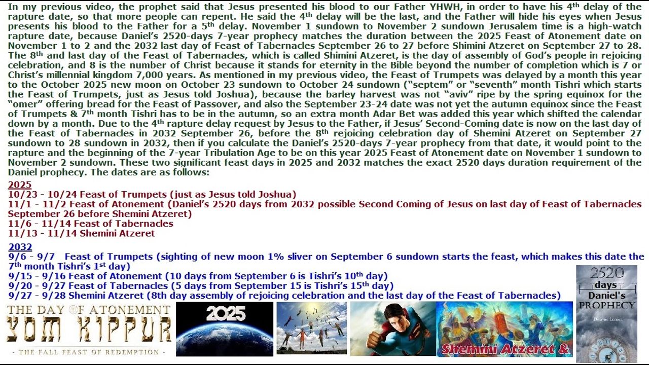 *** Intelligence news update from the Human Homo-Sapiens Race Survival Resistance (HRSR) and Republic Rebel Alliance battlefront (October 2025). In my previous video, the prophet said that Jesus presented his blood to our Father YHWH, in order to have his 4th delay of the rapture date, so that more people can repent. He said the 4th delay will be the last, and the Father will hide his eyes when Jesus presents his blood to the Father for a 5th delay. November 1 sundown to November 2 sundown Jerusalem time is a high-watch rapture date, because Daniel’s 2520-days 7-year prophecy matches the duration between the 2025 Feast of Atonement date on November 1 to 2 and the 2032 last day of Feast of Tabernacles September 26 to 27 before Shimini Atzeret on September 27 to 28. The 8th and last day of the Feast of Tabernacles, which is called Shimini Atzeret, is the day of assembly of God’s people in rejoicing celebration, and 8 is the number of Christ because it stands for eternity in the Bible beyond the number of completion which is 7 or Christ’s millennial kingdom 7,000 years. As mentioned in my previous video, the Feast of Trumpets was delayed by a month this year to the October 2025 new moon on October 23 sundown to October 24 sundown (“septem” or “seventh” month Tishri which starts the Feast of Trumpets, just as Jesus told Joshua), because the barley harvest was not “aviv” ripe by the spring equinox for the “omer” offering bread for the Feast of Passover, and also the September 23-24 date was not yet the autumn equinox since the Feast of Trumpets & 7th month Tishri has to be in the autumn, so an extra month Adar Bet was added this year which shifted the calendar down by a month. Due to the 4th rapture delay request by Jesus to the Father, if Jesus’ Second-Coming date is now on the last day of the Feast of Tabernacles in 2032 September 26, before the 8th rejoicing celebration day of Shemini Atzeret on September 27 sundown to 28 sundown in 2032, then if you calculate the Daniel’s 2520-days 7-year prophecy from that date, it would point to the rapture and the beginning of the 7-year Tribulation Age to be on this year 2025 Feast of Atonement date on November 1 sundown to November 2 sundown. These two significant feast days in 2025 and 2032 matches the exact 2520 days duration requirement of the Daniel prophecy. The dates are as follows: