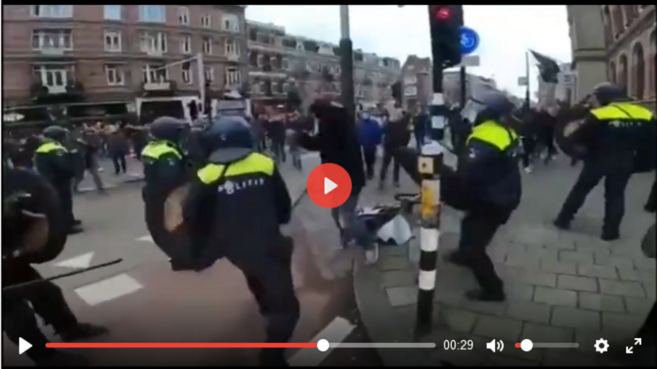 Dutch Police beating a person on the ground with batons, kicking and sicking a dog
