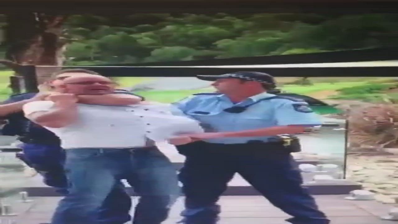 A man arrested, he does not appear to be fighting police, but is being held in a certain way by one of the policemen which according to the lady videoing said hey his face is turning blue!!