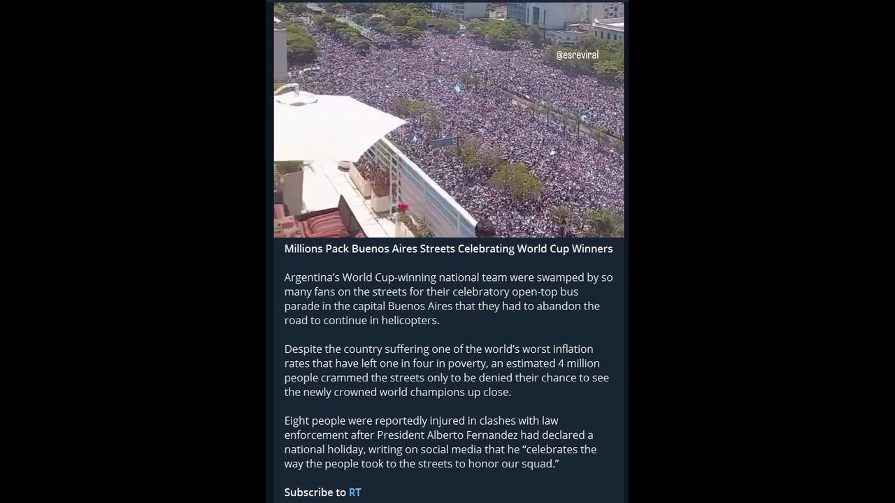 Argentina and world cup FIFA 2022. Note how joy can be as powerful a tool as fear in culling people's rational mind and driving them to mass hysteria like a drugged herd despite their country's disastrous multi sectoriel status.