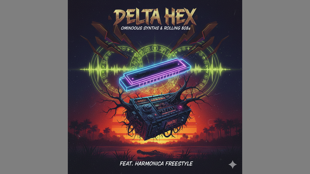 At 80 BPM, ominous synths and rolling 808s introduce a Southern Hip-Hop track, A clean, bright harmonica improvises freely—single notes, chords, bursts, and drawn tones—floating expressively above sparse trap drums and swung hi-hats, Verses are minimal with chopped brass stabs, while hooks surge with distorted bass, thick vocal chants, and dense, layered textures, creating a powerful, commanding climax