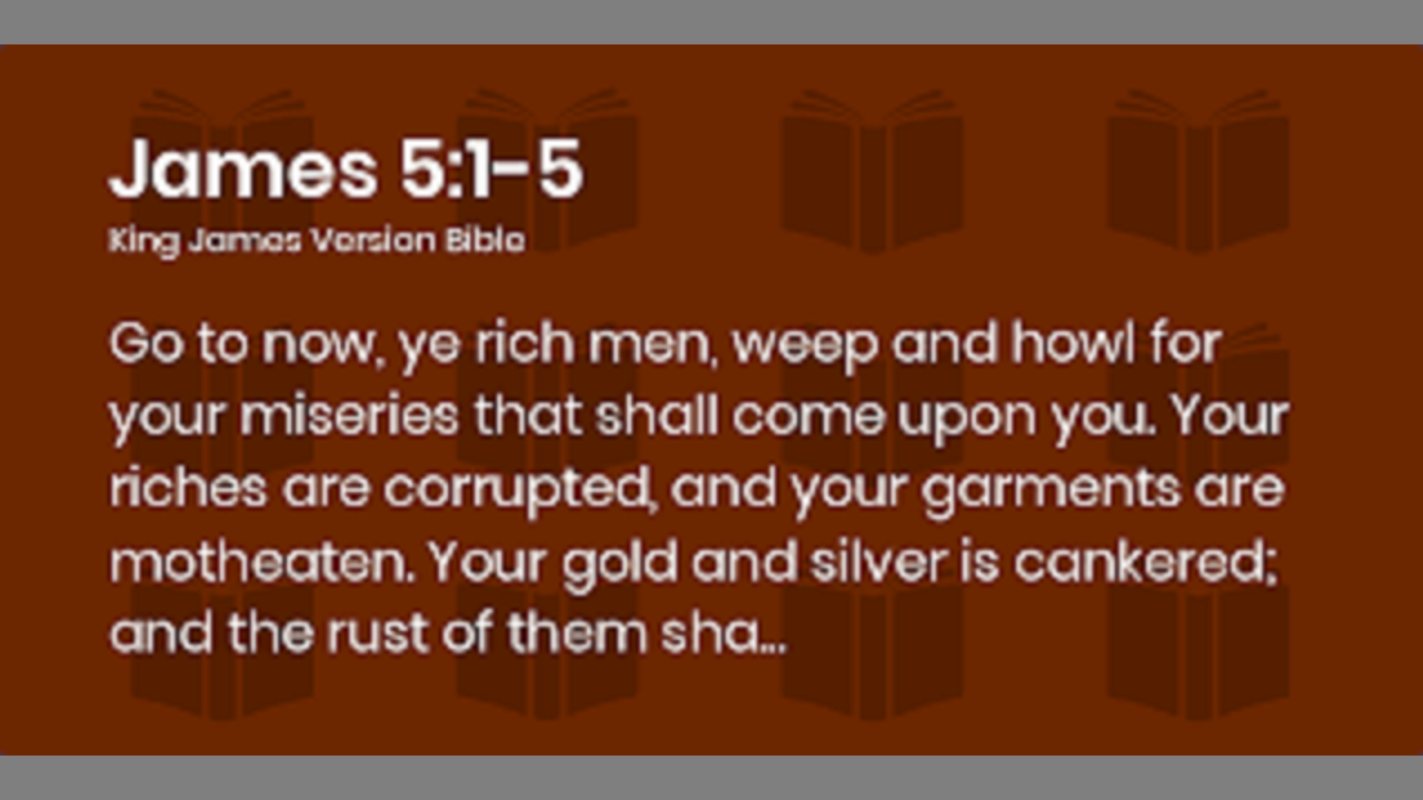 Come now, you rich, weep and howl for the miseries that are coming upon you. 2 Your riches have rotted and your garments are moth-eaten. 3 Your gold and silver have corroded, and their corrosion will be evidence against you and will eat your flesh like fire. You have laid up treasure in the last days. 4 Behold, the wages of the laborers who mowed your fields, which you kept back by fraud, are crying out against you, and the cries of the harvesters have reached the ears of the Lord of hosts. 5 You have lived on the earth in luxury and in self-indulgence. You have fattened your hearts in a day of slaughter. James 5:1-5