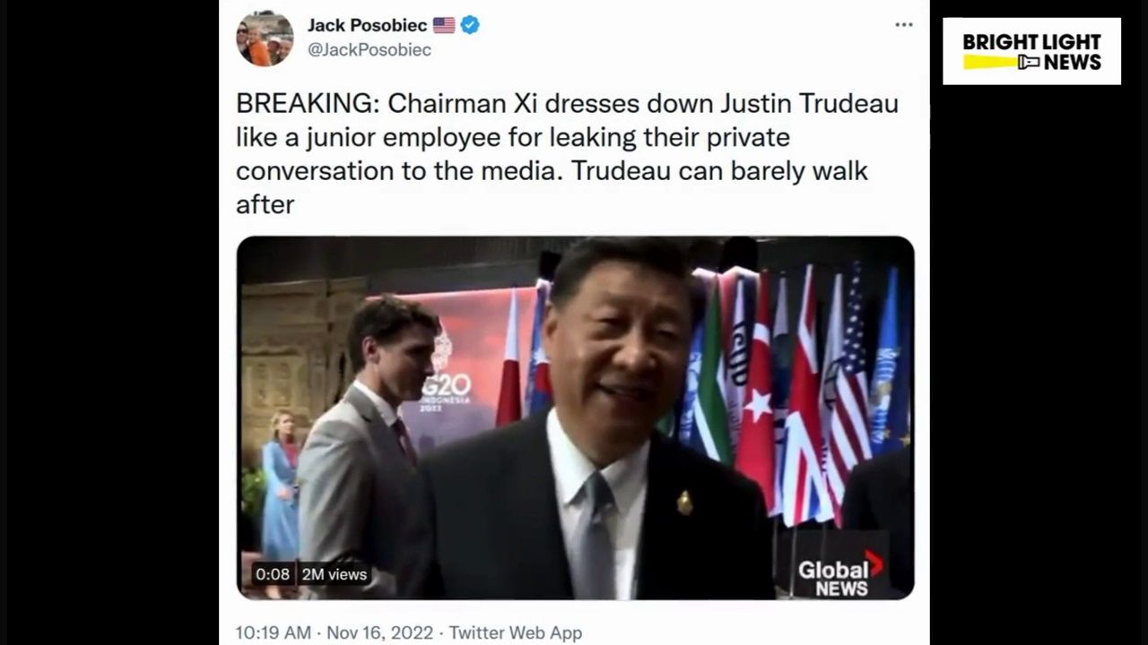 More than 2 million views since being tweeted this morning, “BREAKING: Chairman Xi dresses down Justin Trudeau like a junior employee for leaking their private conversation to the media. Trudeau can barely walk after.”
