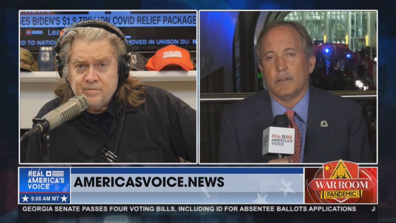 Ken Paxton talks with Bannon's War Room on the eve of Trump's 2021 CPAC Speech.