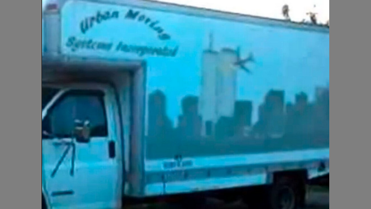 100% proof Israel and CIA did 9 1. All the evidence and all the guilty. photo, is jewish company, Urban Moving systems, truck used to bring demolition team into buildings at night.