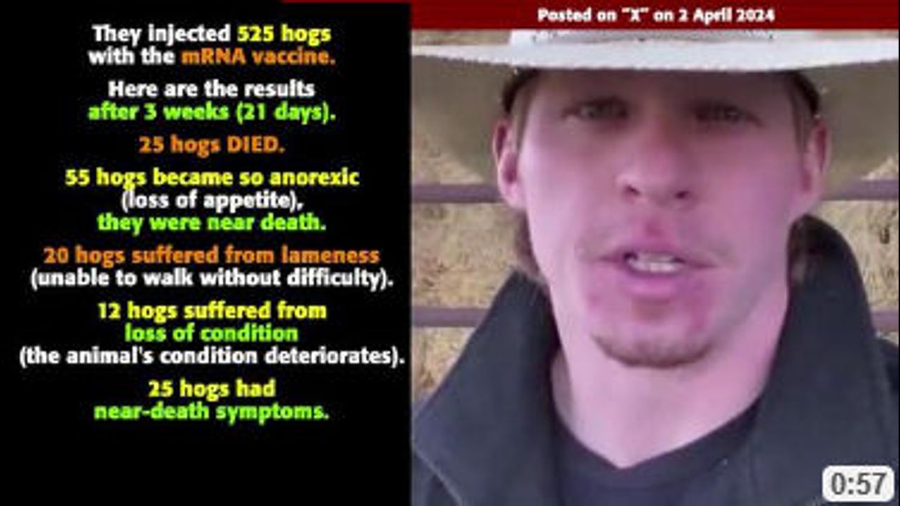 They injected 525 hogs with the mRNA vaccine. Here are the results after 3 weeks (21 days). 25 hogs DIED. 55 hogs became so anorexic (loss of appetite), they were near death. 20 hogs suffered from lameness (unable to walk without difficulty). 12 hogs suffered from loss of condition (the animal's condition deteriorates). 25 hogs had near-death symptoms. 30% of the hogs DIED or had near-death symptoms. They found mRNA in the meat.