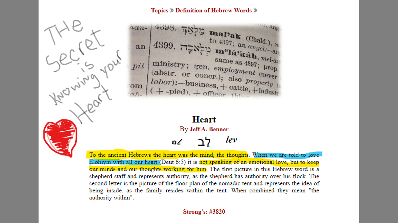 To the ancient Hebrews the heart was the mind, the thoughts. When we are told to love Elohiym with all our heart (Deut 6:5) it is not speaking of an emotional love, but to keep our minds and our thoughts working for him. The first picture in this Hebrew word is a shepherd staff and represents authority, as the shepherd has authority over his flock. The second letter is the picture of the floor plan of the nomadic tent and represents the idea of being inside, as the family resides within the tent. When combined they mean "the authority within".