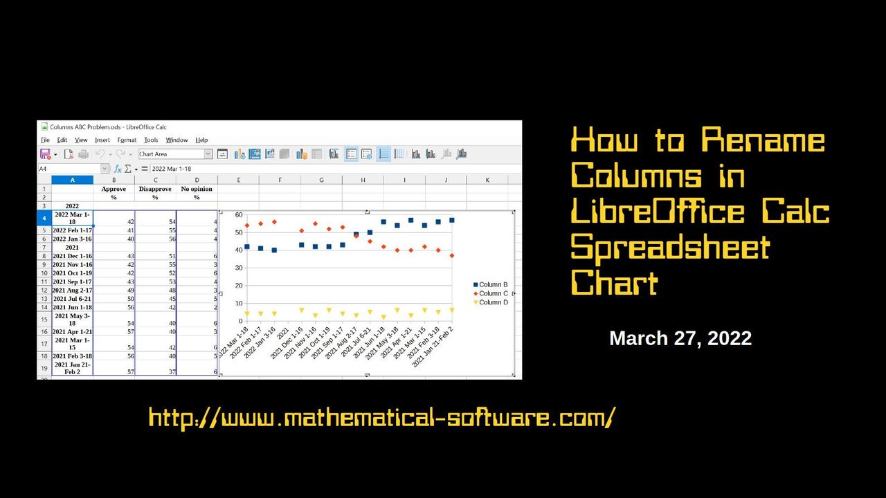 Short video on how to change the column names in a LibreOffice Calc spreadsheet chart. LibreOffice Calc is a free open-source Microsoft Excel "clone" that operates similar to Excel although not exactly the same, read and writes many Excel spreadsheet formats as well as its own spreadsheet format. The video illustrates some other subtleties of configuring the Calc chart as well.