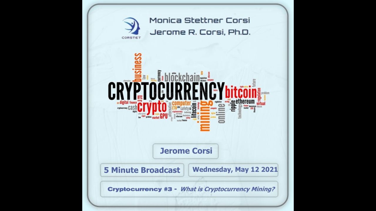 In this 5 minute overview, Dr. Corsi describes one of the many intricacies of the crypto world: "mining." Not with a pan and shovel, but with specialized computers operated by puzzle solvers in search of digital treasure...rewards for performing tasks related to maintaining the validity of the blockchain transactions.