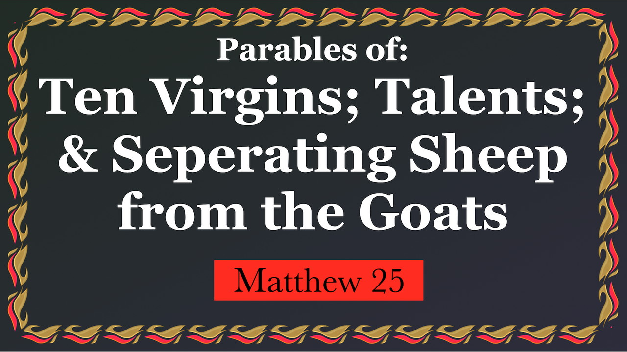 595. Ten Virgins; Parable of Talents; Sheep v Goats. Matthew 25:1-46, Luke 21:37-38