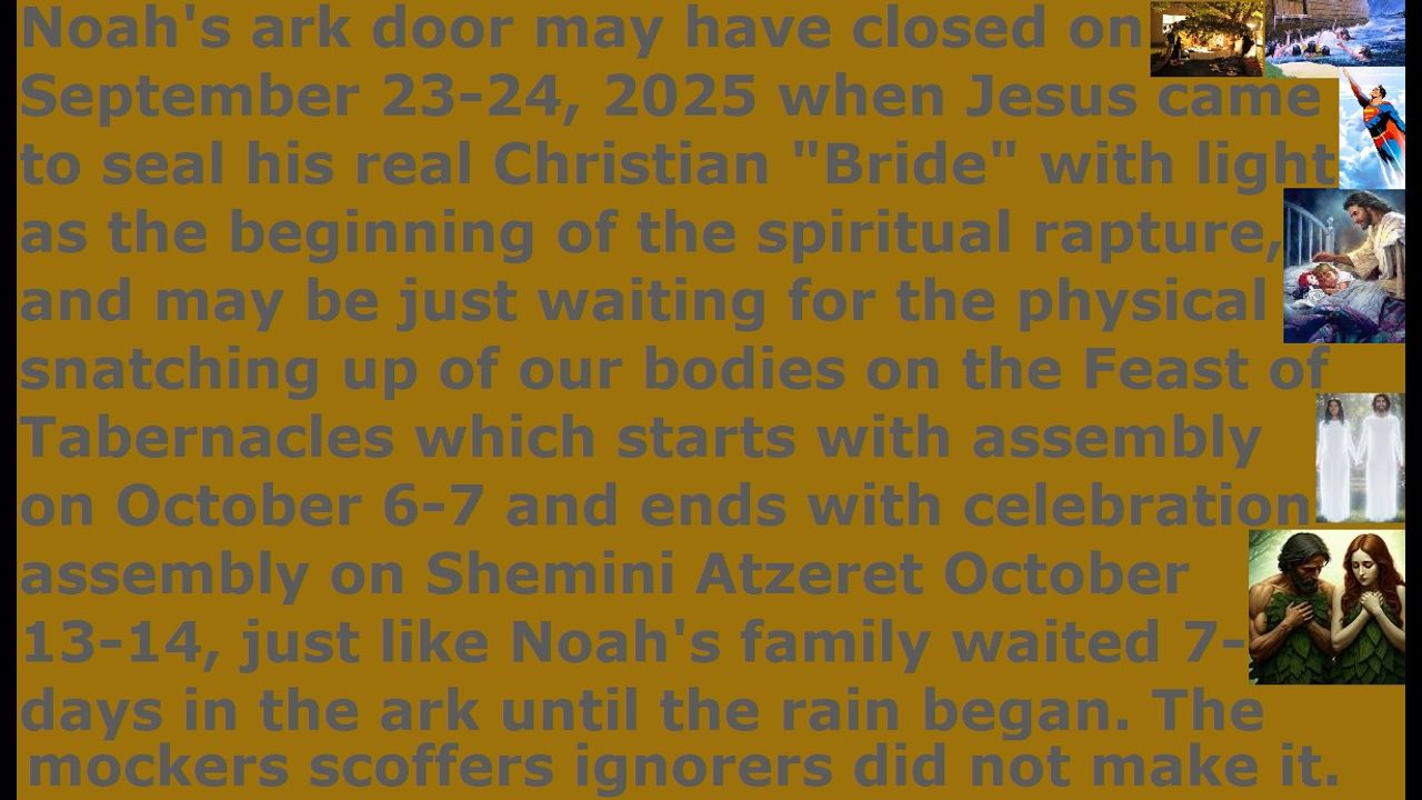 *** Intelligence news update from the Human Homo-Sapiens Race Survival Resistance (HRSR) and Republic Rebel Alliance battlefront (November 2025). There is a possibility that the beginning of the exodus spiritual rapture began on September 23-24, 2025, and there is an exodus journey through the wilderness, and the rapture will culminate with the physical snatching up of the “Bride of Christ” Church saints at the end of the exodus journey. Jesus may have come on September 23-24, 2025 as he told Joshua, in order to start the rapture by sealing his real Christian “Bride of Christ” true Church with a bright light to prepare them for the rapture. The Noah’s Ark door closed on September 23-24, 2025, and just like Noah’s family waited 7 days for the rain to start, Jesus’ “Bride” may be in a waiting period right now to the Feast of Tabernacles, which symbolizes Israel’s journey through the wilderness to eventually crossing the Jordan River where Elijah was raptured. October 6 Jerusalem sundown to 7 sundown is the holy assembly of God’s people to start the Feast of Tabernacles and October 13 Jerusalem sundown to 14 sundown is the holy assembly of God’s people and celebration Shemini Atzeret last 8th day of the Feast of Tabernacles. This may be what Joshua was told, and that would mean that the Tribulation Age 7-year began technically on October 23-24, 2025 when the true Feast of Trumpets was a month later, and the mockers & scoffers people of this earth are on only borrowed time because God’s real Christians are still on this earth until the end of that exodus journey out. That would make it exactly Daniel’s prophecy 2550 days from September 23-24, 2025 spiritual sealing rapture that Jesus gave Joshua as the rapture date to the date that Jesus told Joshua that he would return at Armageddon for his Second Coming on the Feast of Atonement on September 15, 2032, and it would be exactly Daniel’s prophecy 2520 days (7 year Tribulation Age) from the Feast of Trumpets October 23-24, 2025 to the Feast of Atonement on September 15, 2032 Jesus’ Second-Coming. That may be why all of us real Christians received the September 23-24, 2025 confirmation signs from God in each of our lives. This may be why Hlengiwe saw the real Christians, who will be raptured, sealed with a white light, because they are already decided & sanctified & prepared as the already spiritually raptured “Bride of Christ,” who will also be physically raptured at the culmination of the exodus period. God’s Word to Joshua both times that he will rapture his Church Bride on September 23-24, 2025, and his second visit saying that he will rapture his Church Bride in a matter of days, were both true. The seven days of the Feast of Tabernacles which is from October 6 to 13 this year will be symbolic of the Israelites’ exodus out of Egypt to the Red Sea, and the October 13 sundown Jerusalem time to sundown October 14 Shimini Atzeret day of celebration will be symbolic of the Israelites’ celebration upon arriving into the Promised Land heaven out of Egypt or the world. The ignoring fake Christians, and the wishy-washy neutral uncommitted politically-correct two-faced people-pleasers double-tongued popularity-loving fake unbiblical job position pastors, and the “proper business protocol behavior” reprimanding company bosses & coworkers were not sealed on September 23-24, 2025 when Jesus returned to seal his true Church saints for the rapture, because they did not believe and they ignored his wedding invitation. They missed Jesus visitation, just like they missed his first coming 2,000 years ago, and did not recognize Jesus. God’s real Christian “Bride of Christ” 5 wise virgins believe wholly and waited expectantly for Jesus to return.