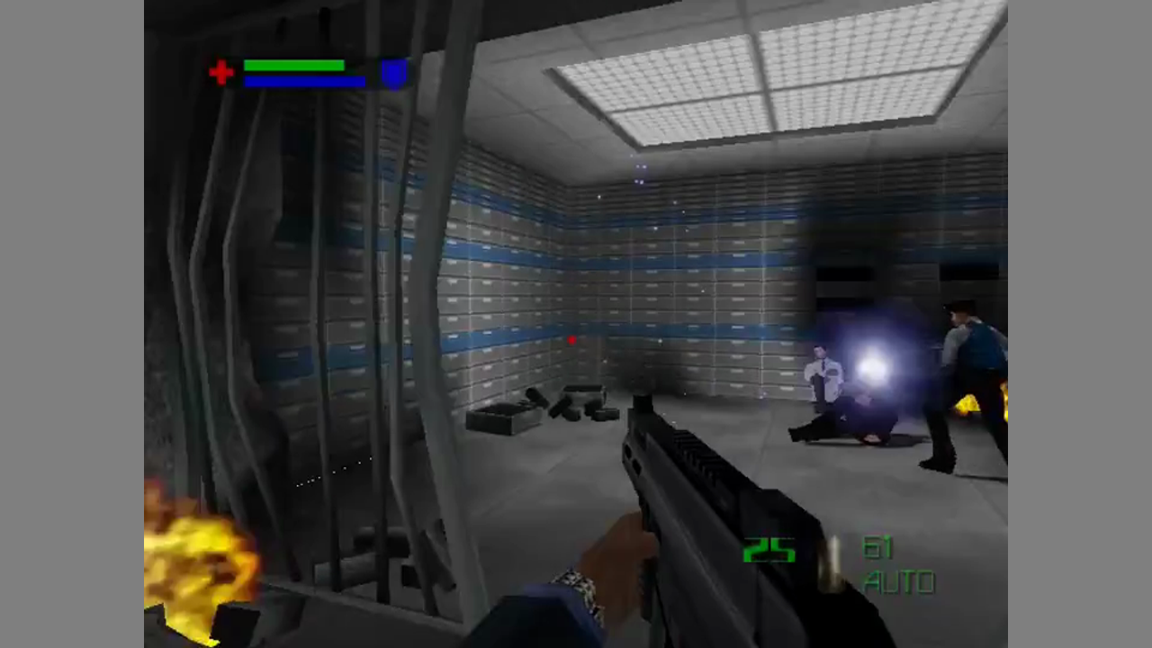 The game is divided into missions based on parts of the movie. Each missions has several objectives to fulfill, and new objectives may occur over the course of the mission. If you fail an objective, you have to repeat the mission. You can jump, crouch and strafe, as well as taking aim mor carefully while standing still. Many weapons have two firing modes you can switch between. You can find obejcts like key cards which must be used in the right place (they are not used automatically), and you have a number of gadgets, like a safe cracker. There is also a watch with four different uses, like functioning as a stun gun or a grappling gun.