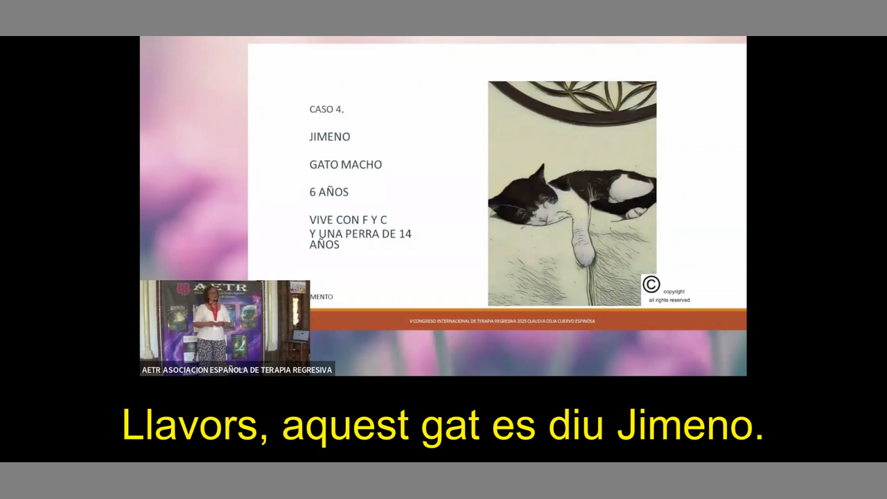 Fragment del vídeo de la llicenciada Claudia Celia Cuervo Espinosa, del cas del gat Jimeno, dins de la ponència titulada «L’ànima i els programes biològics de supervivència», del dijous 29 de maig del 2025, en el marc del Cinquè Congrés Internacional de Teràpia Regressiva celebrat al balneari d’Alicún de las Torres (Granada, Andalusia).