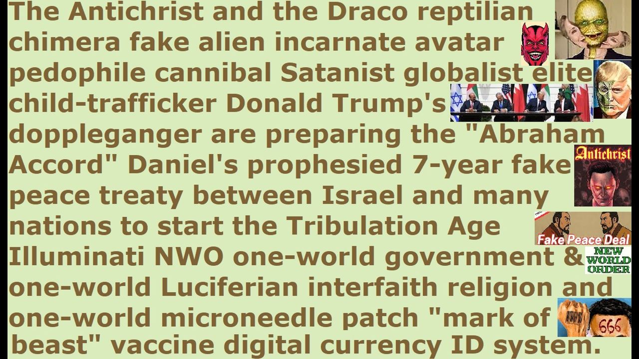 *** Intelligence news update from the Human Homo-Sapiens Race Survival Resistance (HRSR) and Republic Rebel Alliance battlefront (October 2025). The Antichrist and the Draco reptilian chimera fake alien incarnate avatar pedophile cannibal Satanist globalist elite child-trafficker Donald Trump’s doppleganger are preparing the “Abraham Accords” Daniel’s prophesied 7-year fake peace treaty between Israel and many nations to start the Tribulation Age Illuminati NWO one-world government and the one-world Luciferian interfaith religion and the one-world microneedle patch “mark of the beast” vaccine digital currency digital ID system.