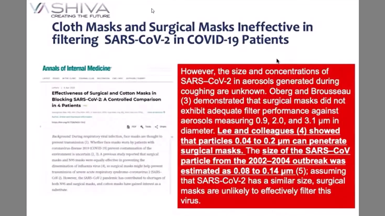 And I was a study done on cloth masks and surgical masks, and it concluded that they're ineffective in filtering the SARS-CoV-2 in COVID-19 patients. And what it said was, it says the size and concentration of the SARS-CoV-2 in aerosols generated in urine coughing are unknown. So we don't really know how much is in there. And Oberg and Brousseau demonstrated that surgical masks did not exhibit adequate filter performance. And Oberg and Brousseau demonstrated that surgical masks did not exhibit adequate filter performance against aerosols measuring 0. 9, 2. 0, and 3. 1 micrometers. And that's about 10 to the minus 6 meters in diameter. And Lee and colleagues showed that particles which are in the range of 0. 04 to 0. 2 micrometers can penetrate surgical masks, okay? So anything that's in that size, 0.